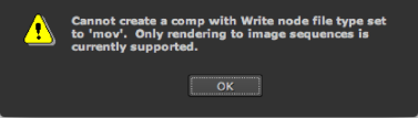 NOTE: Create Comp currently only supports rendering to image sequence formats, such as .dpx and .exr files. Rendering to container formats, such as .mov, displays the following warning: