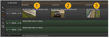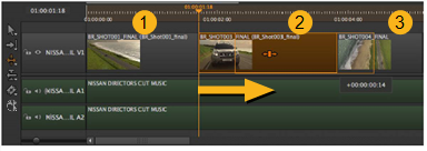 For example, if you slide the target clip instance (2) five frames to the right, the preceding item (1) ends five frames later and the next item (3) starts five frames later.