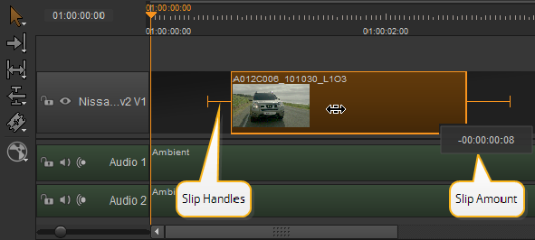 NOTE: Using the Slip Clip tool does not move the clip instance on the timeline, only the output is changed.