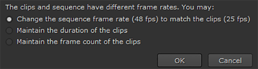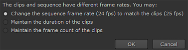 However, if the timeline is already populated and the clip you’re adding doesn’t have the same frame rate as the timeline, you’re prompted to choose whether the clip’s duration or frame count is retained.