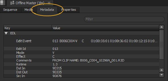 To view metadata for a clip instance, select the Metadata tab in the timeline panel and click on the item to examine.
