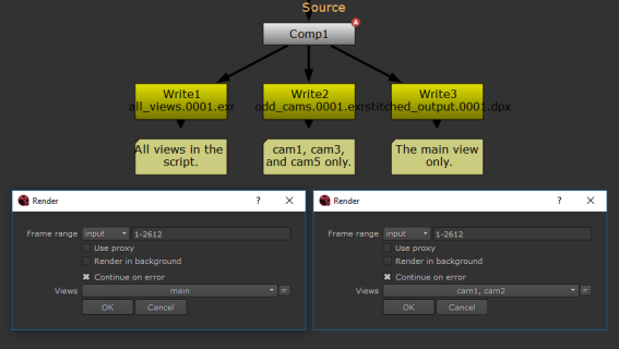 For example, if your script contained two Write nodes calling for the main view and left and right views, but the Render dialog is set to render main, then only the main view is rendered.
