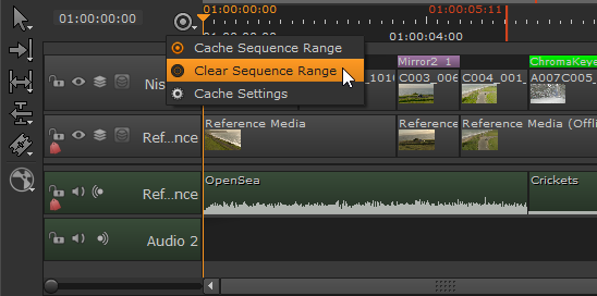 You can also clear selected ranges of clips from a sequence, rather than the entire sequence, from the timeline itself or from the Cache menu: