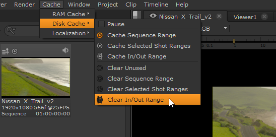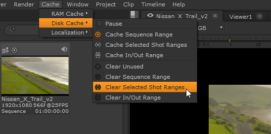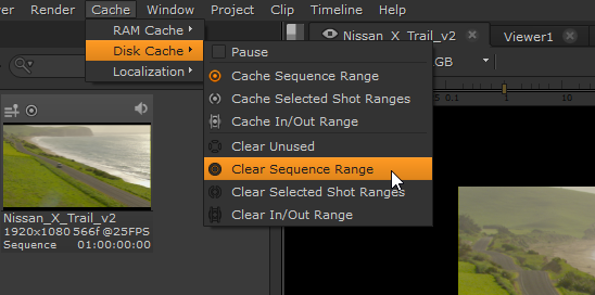 • Select the required clip range in the timeline tab and then select Cache > Disk Cache > Clear Selected Shot Ranges from the menu bar.