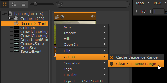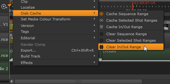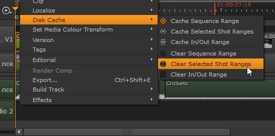 • Select the required clip range in the timeline tab, right-click and then select Disk Cache > Clear Selected Shot Ranges.