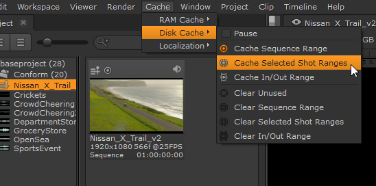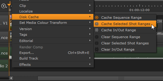 • Select the required clip range in the timeline tab, right-click and then select Disk Cache > Cache Selected Shot Ranges.