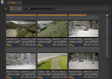 As clips cache, a progress bar displays in the thumbnail. Fully cached clips are marked with an orange bar at the top of the thumbnail.