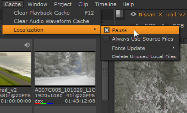 Nuke Studio has the facility to cache bin files locally, either individually or by setting an automatically localized folder (NUKE_TEMP_DIR/localize, by default), to help guarantee playback stability. Local caching is controlled initially in the Preferences dialog, then on a clip-by-clip basis.