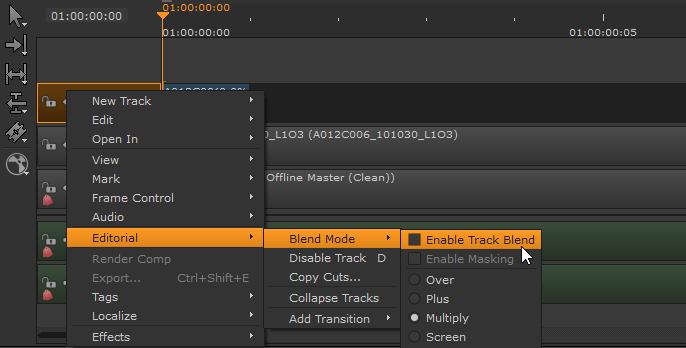 Right-click in the header of the target track and select Editorial > Blend Mode > Enable Track Blend.