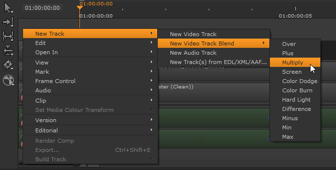 | 1. | Right-click in the timeline, select New Track > New Video Track Blend, and then choose the blend mode to apply. |