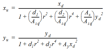 In normalized coordinates from the distortion center, (xu, yu) and (xd, yd) are equal to the same point in an undistorted plate and a distorted plate respectively.