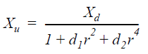 In normalized coordinates from the distortion center, Xu and Xd are equal to the same point in an undistorted plate and a distorted plate respectively.