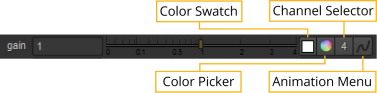 In the Properties panels, there are usually four extra controls to the right of a control including color swatch, color picker, channel selector and the animation menu. The first three are color controls. For more information about using the animation menu, see Animating Parameters.