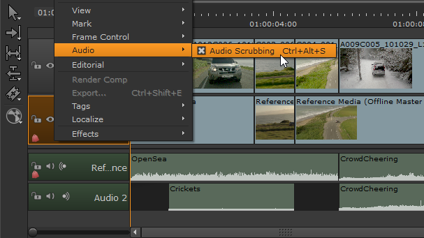 Nuke Studio's timeline supports audio scrubbing, allowing you synchronize audio and video more easily while scrubbing the playhead. Audio scrubbing is enabled by default, but you can disable it by right-clicking in the timeline tab and clicking Audio > Audio Scrubbing or by pressing Ctrl/Cmd+Alt+S.