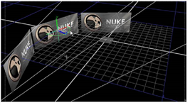 | 2. | Select and move Camera1 in the Viewer window. As you do so, the three cards controlled by the TransformGeo1 node rotate to “look at” the camera location. |