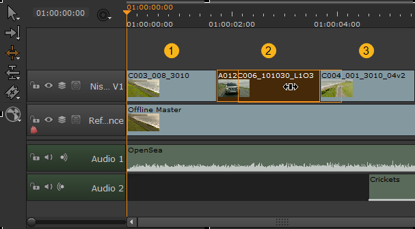 For example, if you slide the target shot (2) five frames to the right, the preceding item (1) ends five frames later and the next item (3) starts five frames later.