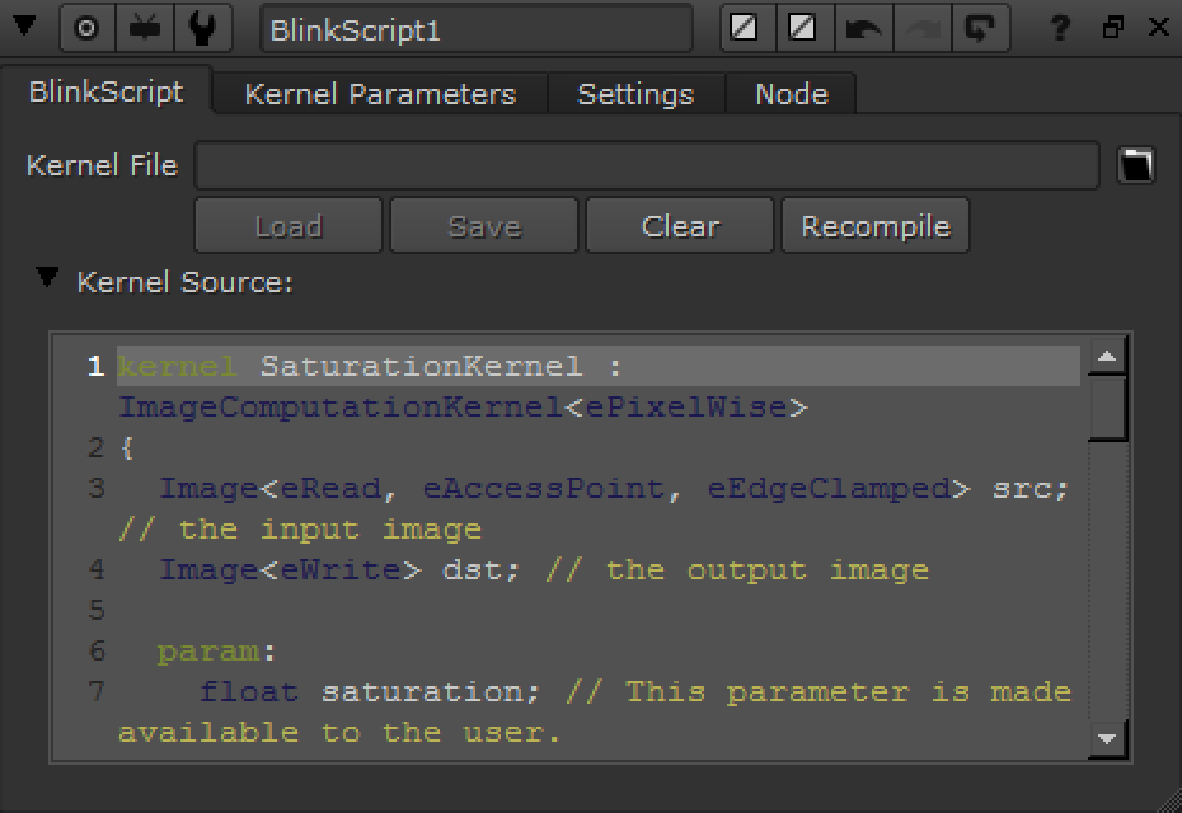 Kernel management is taken care of on the first tab of the BlinkScript properties panel. Double-click the BlinkScript node in the Node Graph to display its properties.