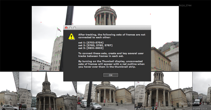 Auto-tracking stills is not perfect and may throw out some disconnected frames, most likely due to a large change in viewpoint. After tracking, set the Thumbnails control above the Viewer to All and hover over images in the thumbnail strip. Thumbnails highlighted in red were not matched with the reference frames around them and are flagged with an error message in the Viewer.