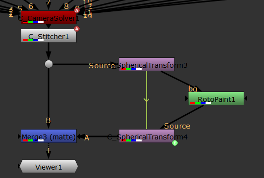 | 7. | To view you paint in latlong space, connect the Viewer to the second C_SphericalTransform node. |