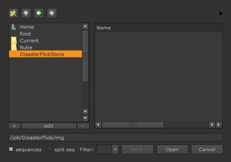 The following entry would create a favorite called DisasterFlickStore which appears on all File Browsers invoked from Read nodes and which points to the /job/DisasterFlick/img directory.
