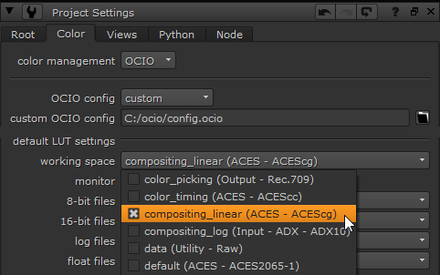 | 5. | You can now pick your role from the default LUT settings. For example, you can set the working space to compositing_linear if you want to work in the ACEScg colorspace. |