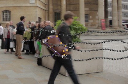 After you have tracked your shape or shapes, you can review your results by scrubbing back and forth on the timeline. You can adjust the planar surface shape if, for example, your roto shape drifts in the course of the tracking, or you simply want to change it. To do this, you can use the planar surface controls.