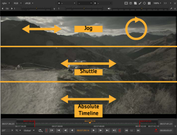 • The jog controls also detect rotary motion to jog through frames. Clockwise motion in the top third of the Viewer, while holding K, advances the playhead and anti-clockwise reverses the playhead.