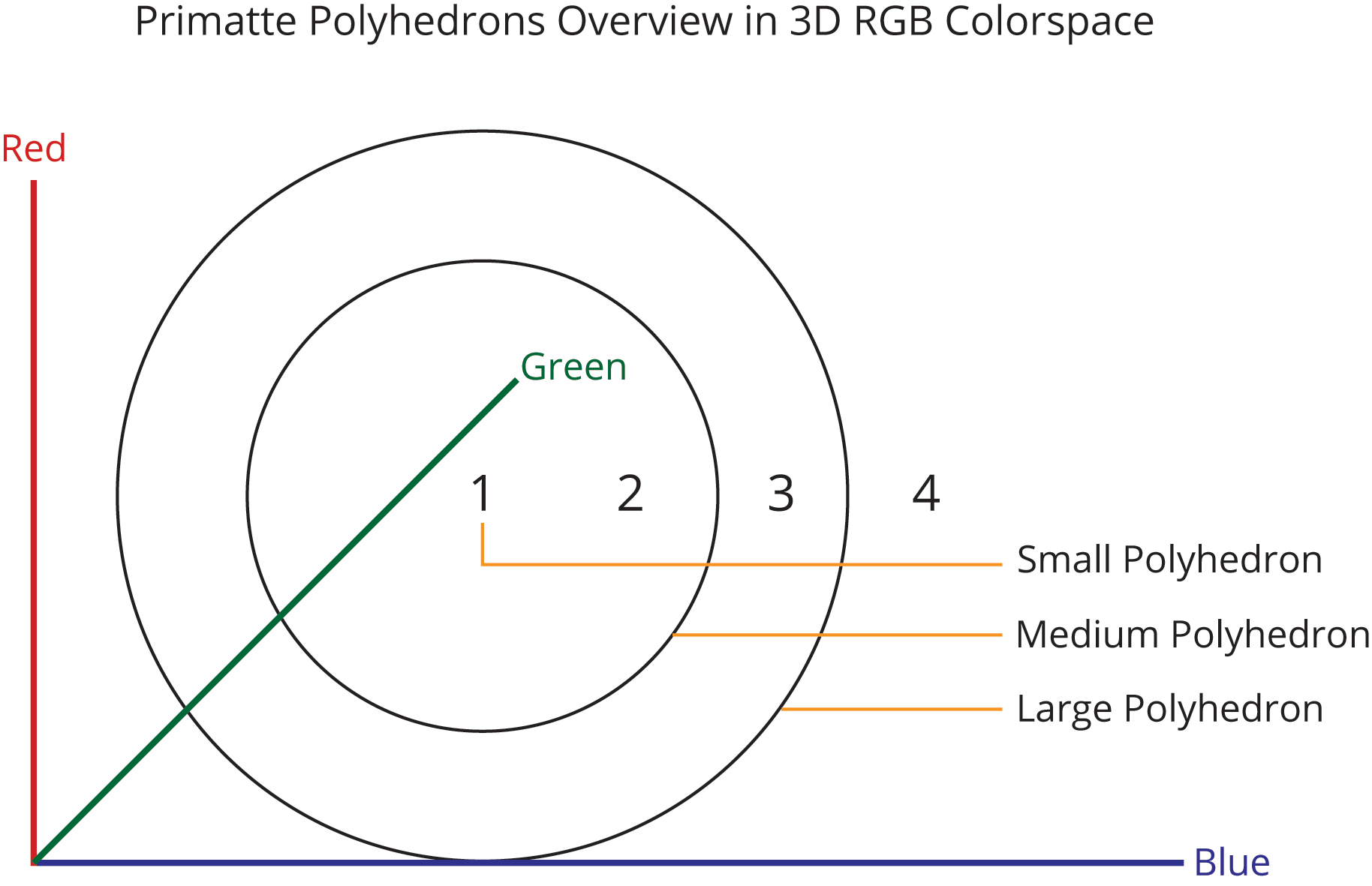By operating the Primatte interface, you essentially create three concentric, multi-faceted polyhedrons. These can be pictured as three globes (or polyhedrons or polys), one within the other, which share a common center point. The creation of these polyhedrons separates all possible foreground colors into one of four regions; inside the small polyhedron (1), between the small and medium polyhedrons (2), between the medium and the large polyhedrons (3) and outside the large polyhedron (4).