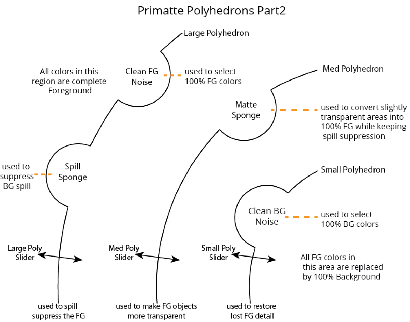 For example, to remove spill, select a region of the composite image with spill on it. Move the spill or large poly slider to the right a little bit, the large poly bulges and the spill should disappear. Move it a little more, if necessary. Moving this slider to the right removes spill (moves the colors from outside the large poly to between the medium and large polyhedrons) and moving it to the left, dents the large poly and moves that color region to outside the large poly.