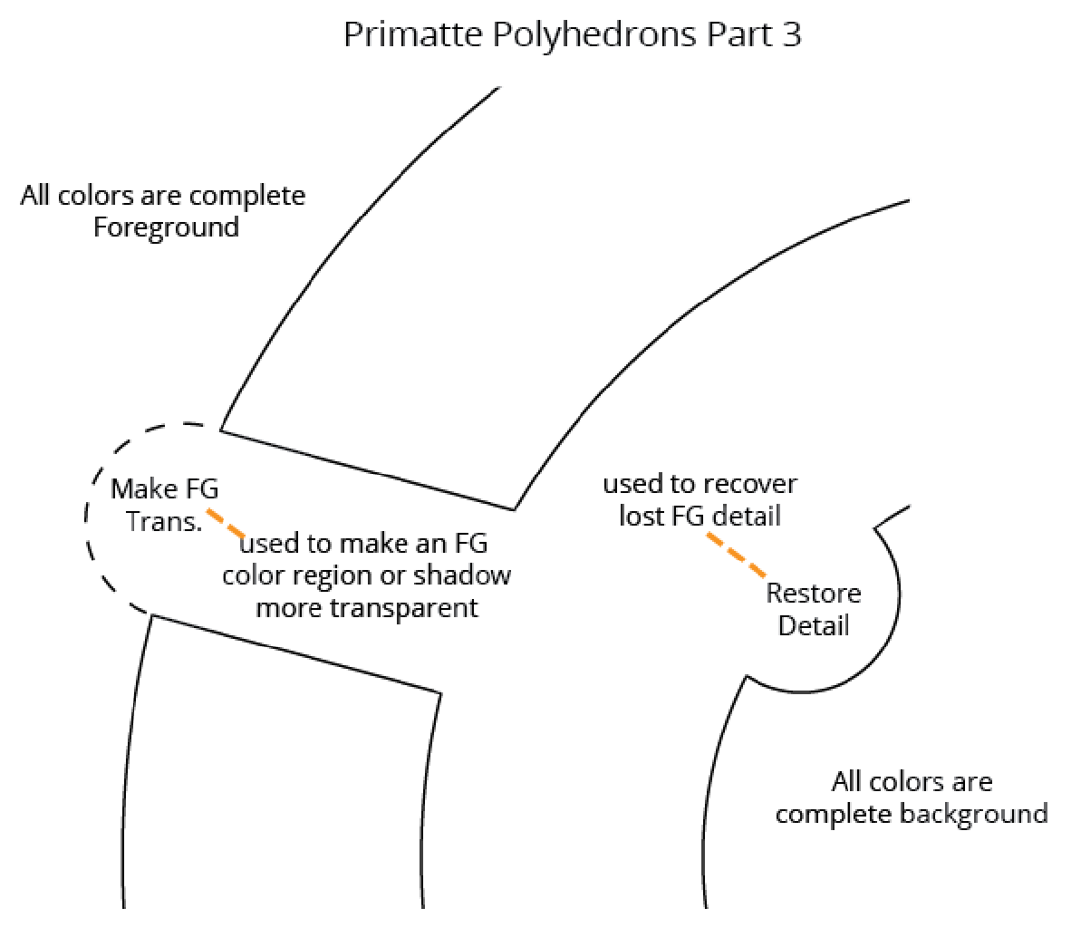 Region 3 (between the medium and large polyhedrons) - This region contains all the foreground image colors that are 100% foreground but have spill suppression applied to them to remove color spill from the backing screen. Otherwise they are 100% solid foreground colors.
