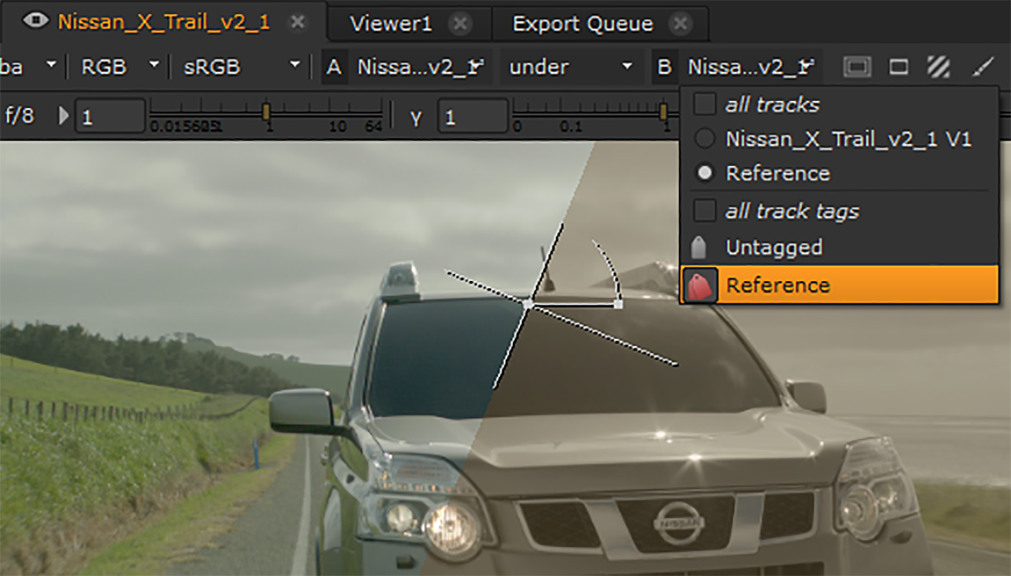 The Viewer A/B tools allow you to quickly compare media using the two Viewer input buffers. Select a clip, sequence, shot or track and press 1 or 2 to place your selection in the Viewer input buffers. You can also drag-and-drop items into the input buffers using the Viewer hotspots.