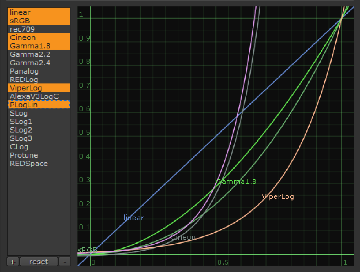 From the list on the left, select the LUT you want to display in the curve editor. To select several LUTs, press Ctrl (Mac users press Cmd) while selecting the LUTs. All the selected LUTs are shown in the curve editor at the same time. |