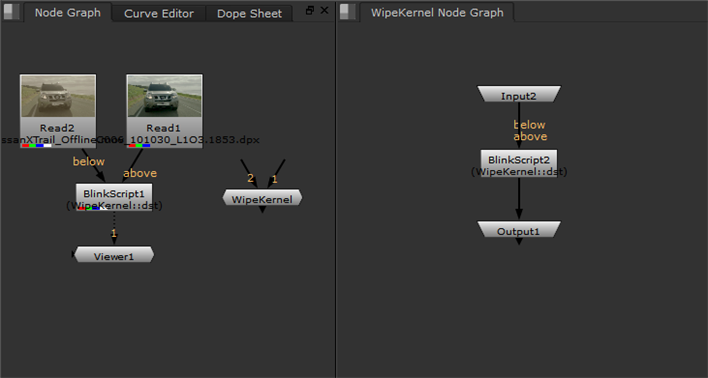 Nuke creates a Group node using the name of the kernel as a label. For example, using the WipeKernel supplied in the documentation produces the following expanded group.