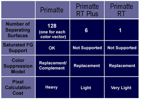 There are three Primatte algorithms. Here is a chart that shows the main differences between them.