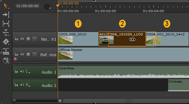 For example, if you slide the target shot (2) five frames to the right, the preceding item (1) ends five frames later and the next item (3) starts five frames later.