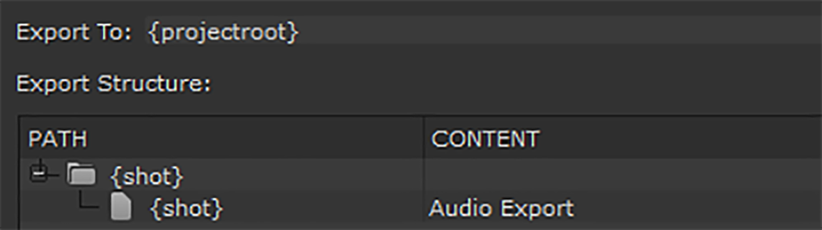 | 4. | Build a custom shot template using Path tokens and the folder and +/- buttons and then click the Content field and select Audio Export from the list. |