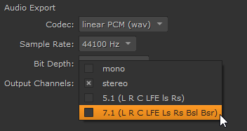 | 5. | Click the Audio Export field and select the required export options, including the Output Channels for multi-channel audio. |