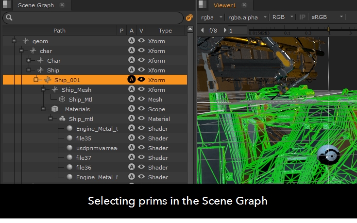 In the Scene Graph tab to the left of the Viewer, you can see the entire scene including any lights, cameras, and materials.