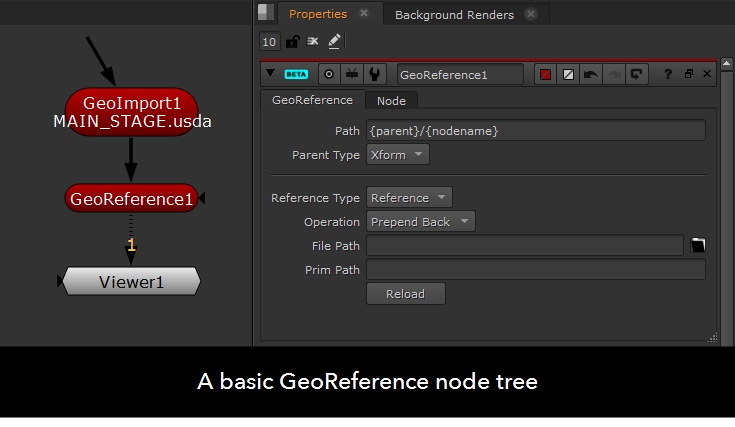 A GeoReference node is added to the Node Graph and its Properties are displayed. In this simple example, the GeoReference node is immediately downstream of the original GeoImport containing the prim we're going to reference. In reality the GeoReference node can be anywhere downstream of the prim it's referencing.