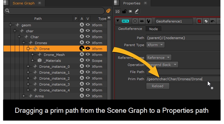 - Enter the Prim Path to the object you want to reference. You can enter the path manually or, if you're not sure what the path is, you can load the file using a GeoImport node and then locate the source object in the Scene Graph tab. Drag the location to the Prim Path control to add it automatically.