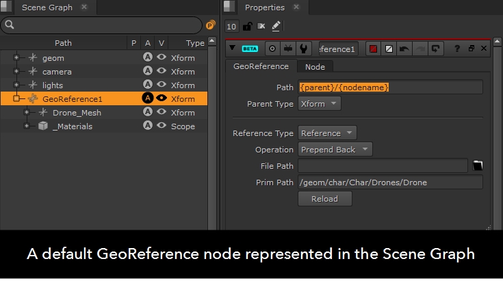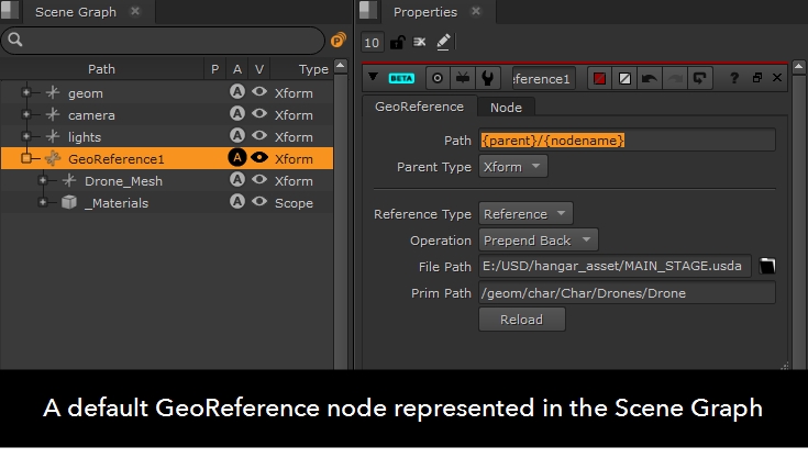 The new reference object is added to the bottom of the scene graph by default using the {parent}/{nodename} variable in the Path control. In this case, {parent} is the root of the scene and {nodename} is GeoReference1.