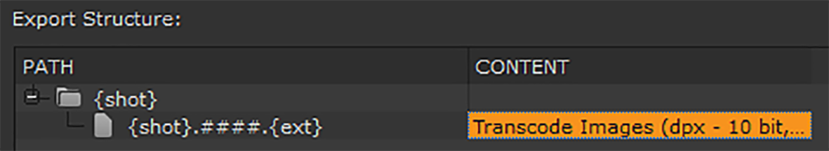 | 2. | Select Process as Shots and use the default, Transcode Shots DPX, or build a shot template using the Path and Contents fields and the folder and +/- buttons. |