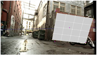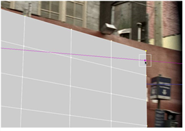 | 5. | Go to a different frame and move one of the blue vertices to match its new location in the src footage. When you do so, a purple line appears. The correct location for the vertex on the current frame should lie somewhere on this line; however, you can drag the vertex away from the line if necessary. |