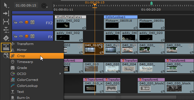 You can add Transform, Grade, and ColorCorrect effects using the keyboard shortcuts Alt+T, Alt+G, and Alt+C, just like the Node Graph equivalents in the composting environment. You can add effects to multiple shot selections or at the playhead if no shots are selected.