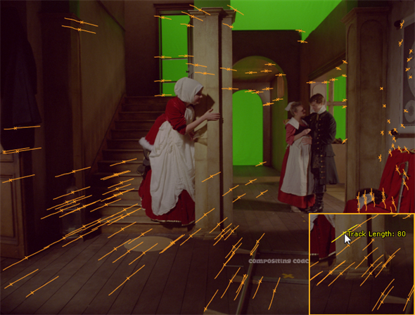 Once tracking is complete, scrub through the timeline to examine the tracked features. The points represent the features and the vectors the track length calculated for the associated feature. Hover over a point to display its length, in frames.