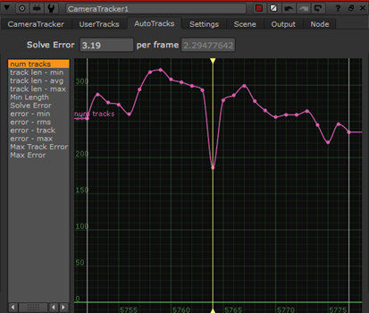 Curves can indicate areas of the sequence where tracking encountered problems. For example, the number of tracks curve on the right shows a significant dip on the current frame, as indicated by the playhead position.