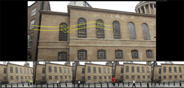 • Switch the Thumbnails control above the Viewer to Tracked. CameraTracker displays the frames that are connected to the current frame in the thumbnail gallery at the bottom of the Viewer. This allows you to simply step through the sequence frame-by-frame to evaluate the connections.