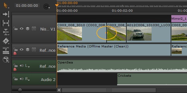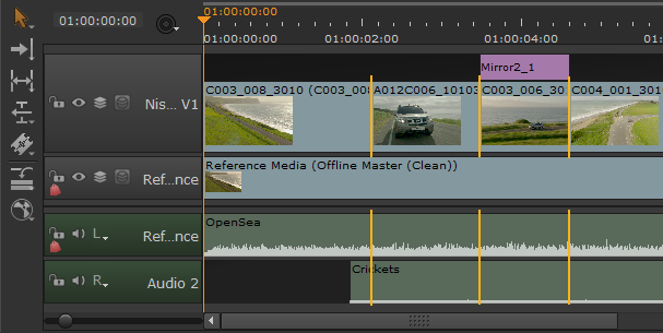 The Copy Cuts function allows you to quickly apply cuts from one track to other tracks on the timeline. For example, in the timeline shown, you could copy the cuts from the second video track to the Reference audio tracks.