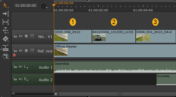 For example, if you slide the target shot (2) five frames to the right, the preceding item (1) ends five frames later and the next item (3) starts five frames later.