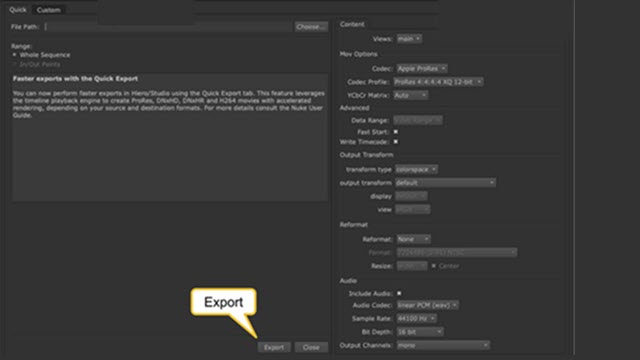 Use Quick Export to exports a sequence in Nuke Studio to a variety of video formats at a fast speed.